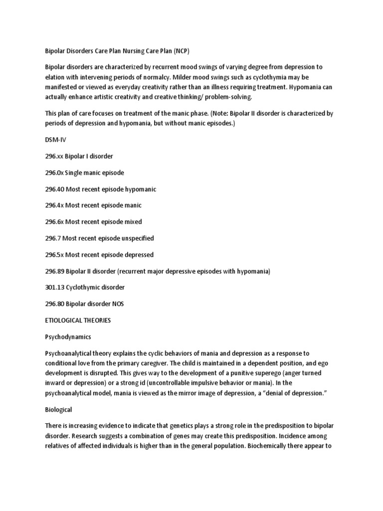Bipolar Disorders Care Plan Nursing Care Plan | Bipolar ... from imgv2-2-f.scribdassets.com Maybe you would like to learn more about one of these? Check spelling or type a new query. Nursing care plan for depression. We did not find results for: